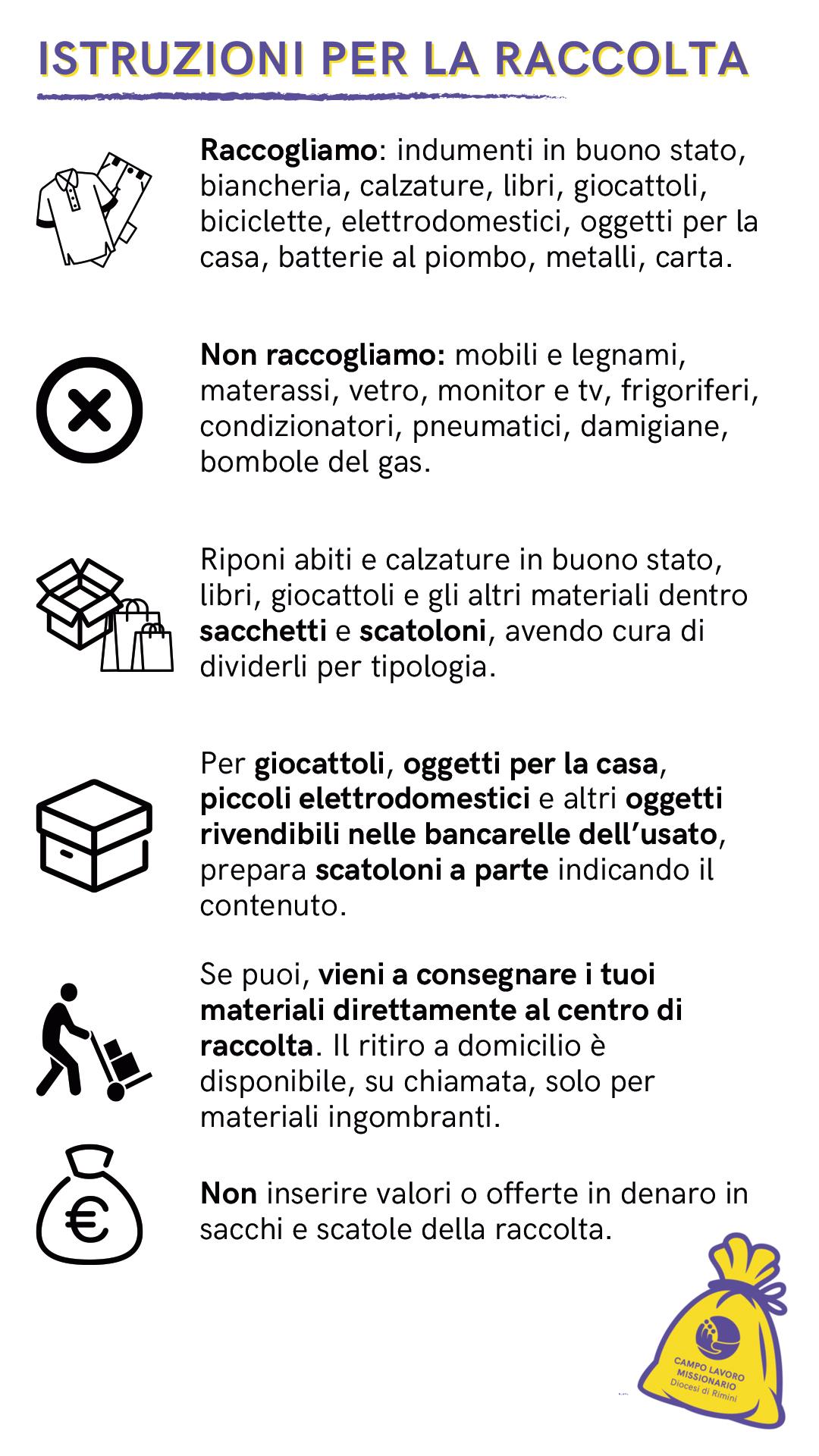 Durante questo weekend, cittadini, parrocchie e associazioni collaborano attivamente raccogliendo materiali destinati al riuso e al riciclo: ferro, metalli, indumenti, scarpe, libri, giocattoli, piccoli elettrodomestici e oggetti per la casa. Tutto il materiale confluisce nei numerosi centri di raccolta distribuiti tra Rimini, Riccione, Santarcangelo, Bellaria, Cattolica e altre località del territorio.