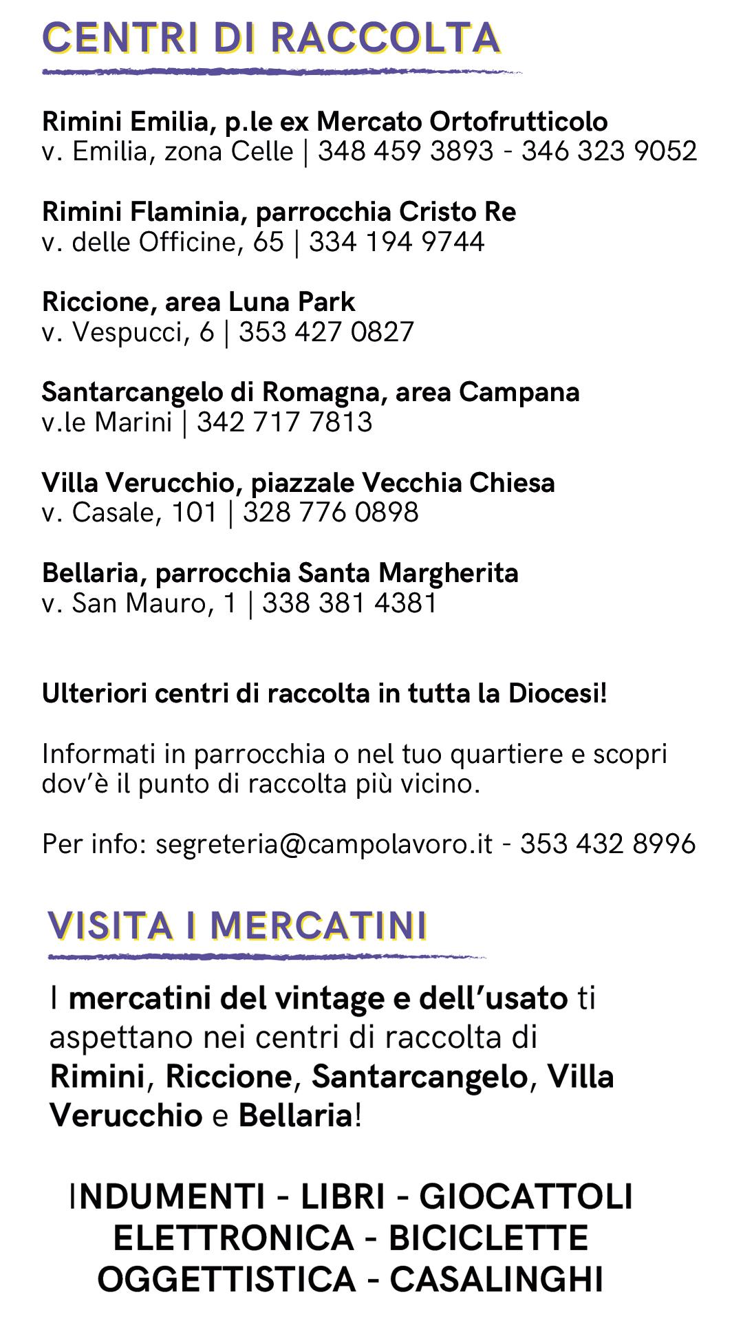 Accanto alla raccolta, il Campo Lavoro è animato da mercatini dell’usato e del vintage, allestiti nei centri e nelle parrocchie, che rappresentano un momento di incontro, partecipazione e sensibilizzazione sui temi del riuso e della sostenibilità.
